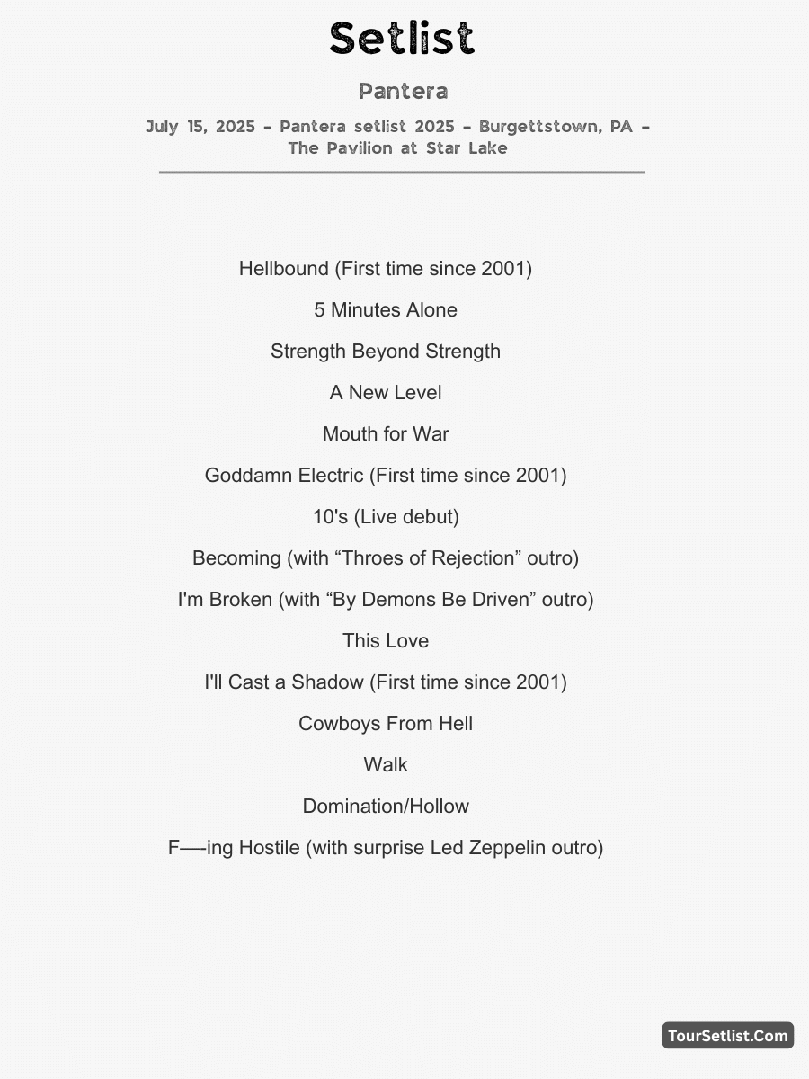 Here’s the full setlist from Pantera’s August 29, 2025 show at T-Mobile Arena in Las Vegas, NV—part of The Heaviest Tour of the Summer, featuring support from Amon Amarth and King Parrot:
